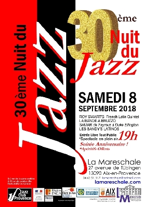 La Mareschale fête les 30 ans de cette Nuit Incroyable qui dure, temps fort de la rentrée, soirée anniversaire rythmée, métissée, renouvelée ! Des chanteurs et musiciens talentueux sur scène en plein air, énorme soirée en perspective, apéritifs offerts à tous, ça va bouger, danser, swinger, groover, ambiance garantie, venez nombreux fêter La Nuit du Jazz !